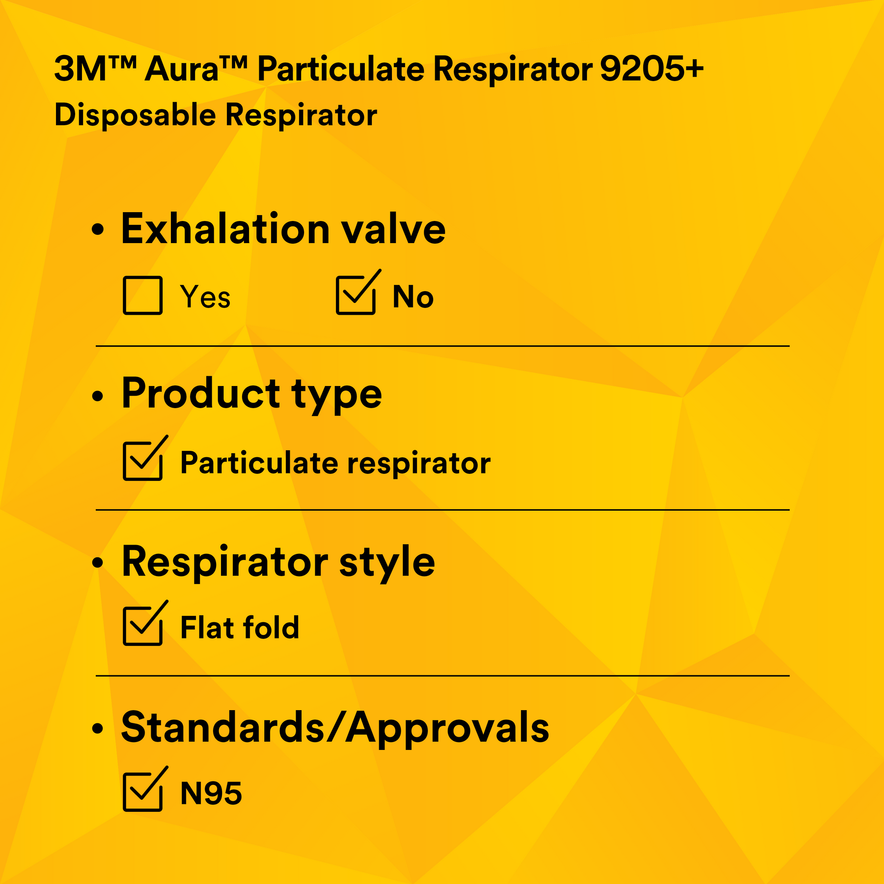 • 3M Aura? Particulate Respirator 9205+, N95 - High Performance Flat-Fold Respirator Overview The 3M Aura? 9205+ is an ultra-lightweight, flat-fold N95 respirator engineered to deliver at least 95 percent filtration of non-oil particulates at an airflow rate of 85 L/min